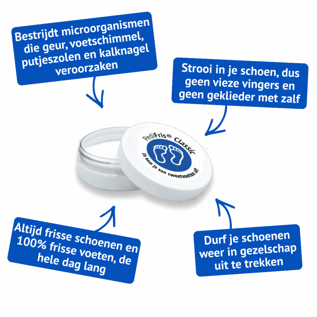 PediFris® Classic: Elimineert geurveroorzakende micro-organismen direct in je schoenen. Het is het beste middel tegen stinkvoeten en stinkende schoenen.